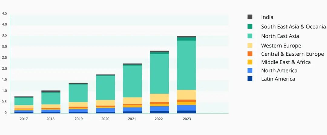 據(jù)愛(ài)立信的預(yù)測(cè),到2023年,連接到已經(jīng)部署的蜂窩物聯(lián)網(wǎng)網(wǎng)絡(luò)的設(shè)備數(shù)量將以19%的年復(fù)合增長(zhǎng)率增長(zhǎng)。這意味著,到2023年,預(yù)計(jì)將有超過(guò)200億臺(tái)IoT設(shè)備連接在一起,尤其是在LTE和5G上,其中大部分應(yīng)用將主要集中在中國(guó)和東北亞地區(qū)。